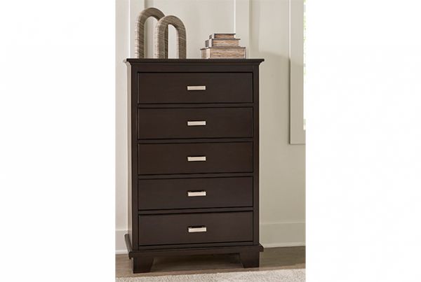 Feast your eyes on this richly versatile chest of drawers. Its traditional-inspired dark brown finish effortlessly blends with contemporary bright nickel-tone pulls to create a stunning look that's not too stuffy or too trendy. Spacious drawers offer plenty of storage for your wardrobe and spare bed linens.