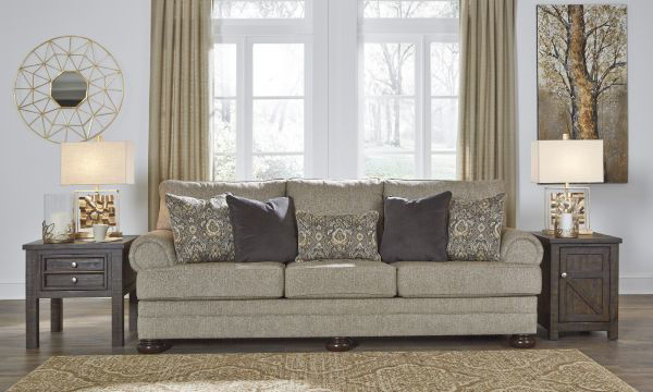 This sumptuously styled sofa proves that a richly traditional look doesn’t have to break the bank. Flared effect gives the classic roll arms a relaxed feel, while the choice of a plush chenille upholstery in oatmeal is earthy elegance at its best. Distinctively turned bun feet in a dark finish add to the sofa's substantial presence.