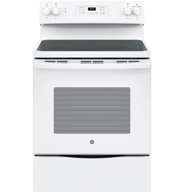 This 30 in. 5.3 cu. ft. GE Free-Standing Electric Range is featured in a classic white finish and features a Digital Temperature display. A Power Boil dual-element burner with 9 in. and 6 in. capability gives you 3000-Watt of power. The 4-burner upswept cooktop easily wipes clean. The white patterned ceramic glass top contains spills and allows for easy cleaning. Dual Element Bake with upper and lower elements produce even heat and great results. The removable full-width storage drawer lets you store cookware or kitchen accessories.