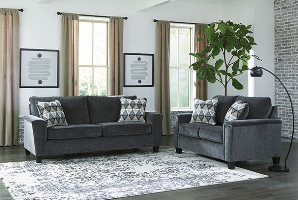 If you’re looking for a smokin’ hot look priced to entice, you’re sure to find this space-conscious, budget-conscious sofa beautifully fits the bill. Covered in a smoke gray chenille upholstery loaded with plush texture, this less-is-more contemporary sofa is dressed to impress with angled side profiling and track armrests wrapped with a layer of pillowy softness for that little something extra. Crisp and clean, the 2-over-2 cushion styling adds up to one sensational look. Corner-blocked frame Attached back and loose seat cushions High-resiliency foam cushions wrapped in thick poly fiber Polyester upholstery 2 throw pillows included Pillows with soft polyfill Exposed tapered feet