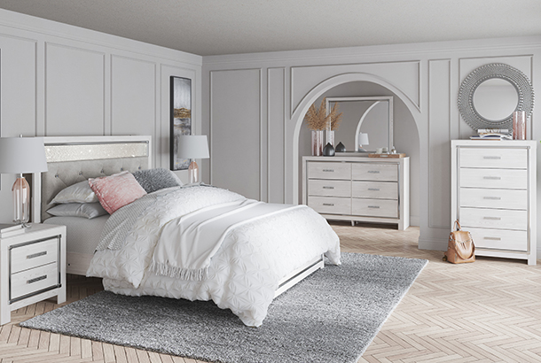 The epitome of fashion-forward design, this Altyra panel platform bed is a beautiful blend of comfort and luxury. Shiny chrome-tone accents, a pearlized finish and button-tufted upholstery bring a glam touch to the richly rustic appearance. Remote-controlled LED lighting adds style and modern convenience to your restful retreat.