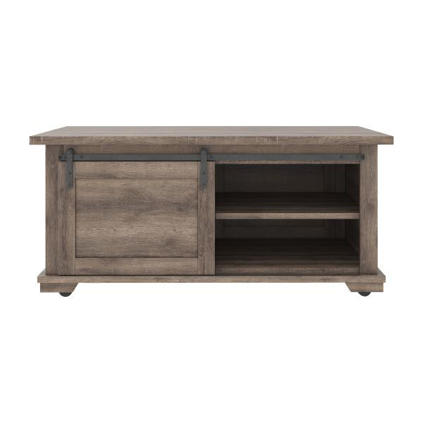 Raise the bar on modern farmhouse design with the Arlenbry storage coffee table. Sporting a handsome weathered oak effect and cross buck accents, the table's unique sliding "barn door" moves to reveal shelved storage space. Easy roll casters add a cool touch that's right on trend.