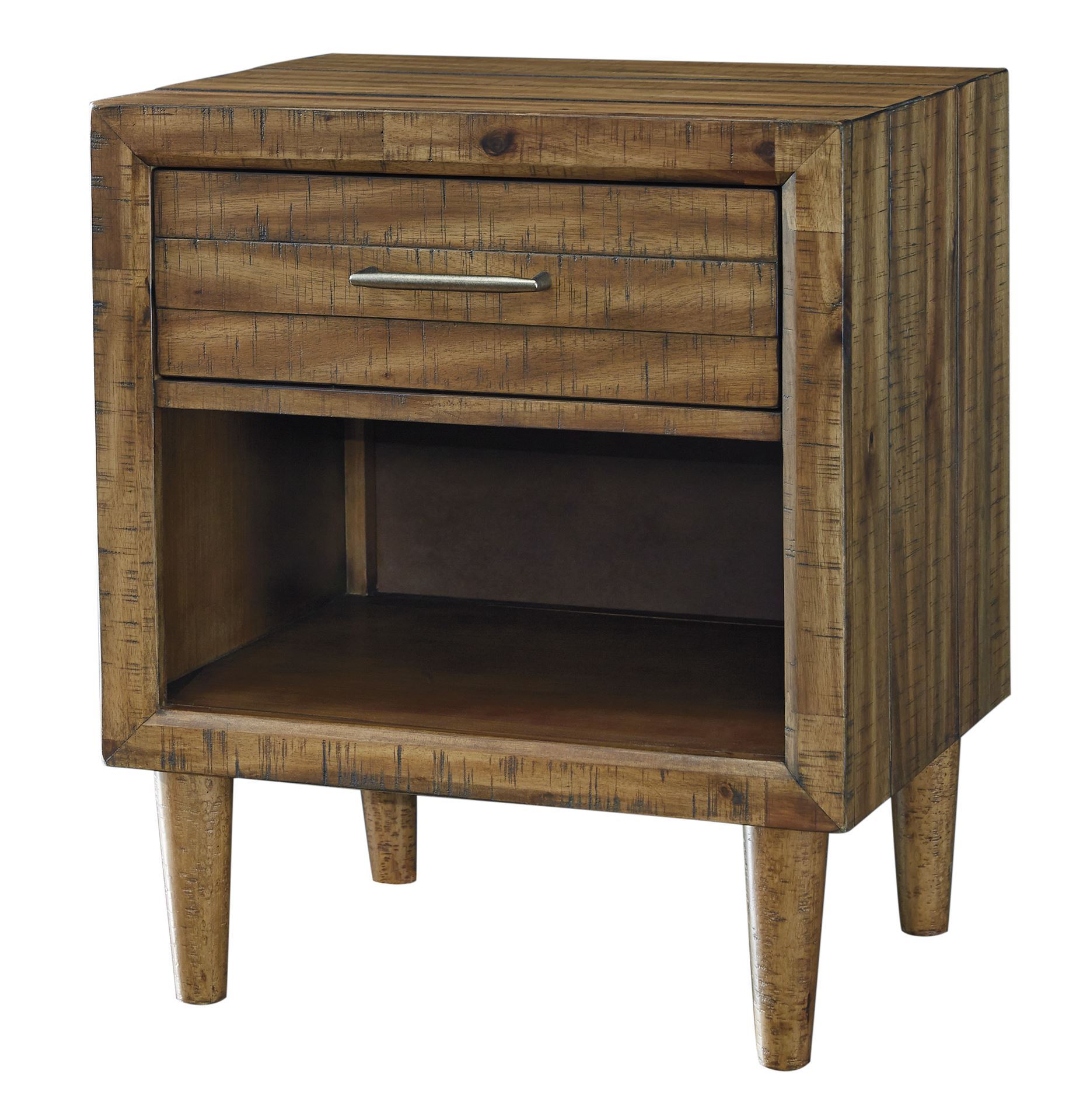 Made with Acacia veneers and select hardwood solids and finished in a medium brown finish with saw kerf distressing effect. Design of bedroom is contemporary with a touch of the rustic aesthetic. Cases have profiled frame and tapered round turned legs. Drawer fronts, sides and top have a planked look. Fully finished French/English drawer box with ball bearing drawers glides. Chevron veneer layup of headboard panel and door of bachelor chest. Picture frame mirror.