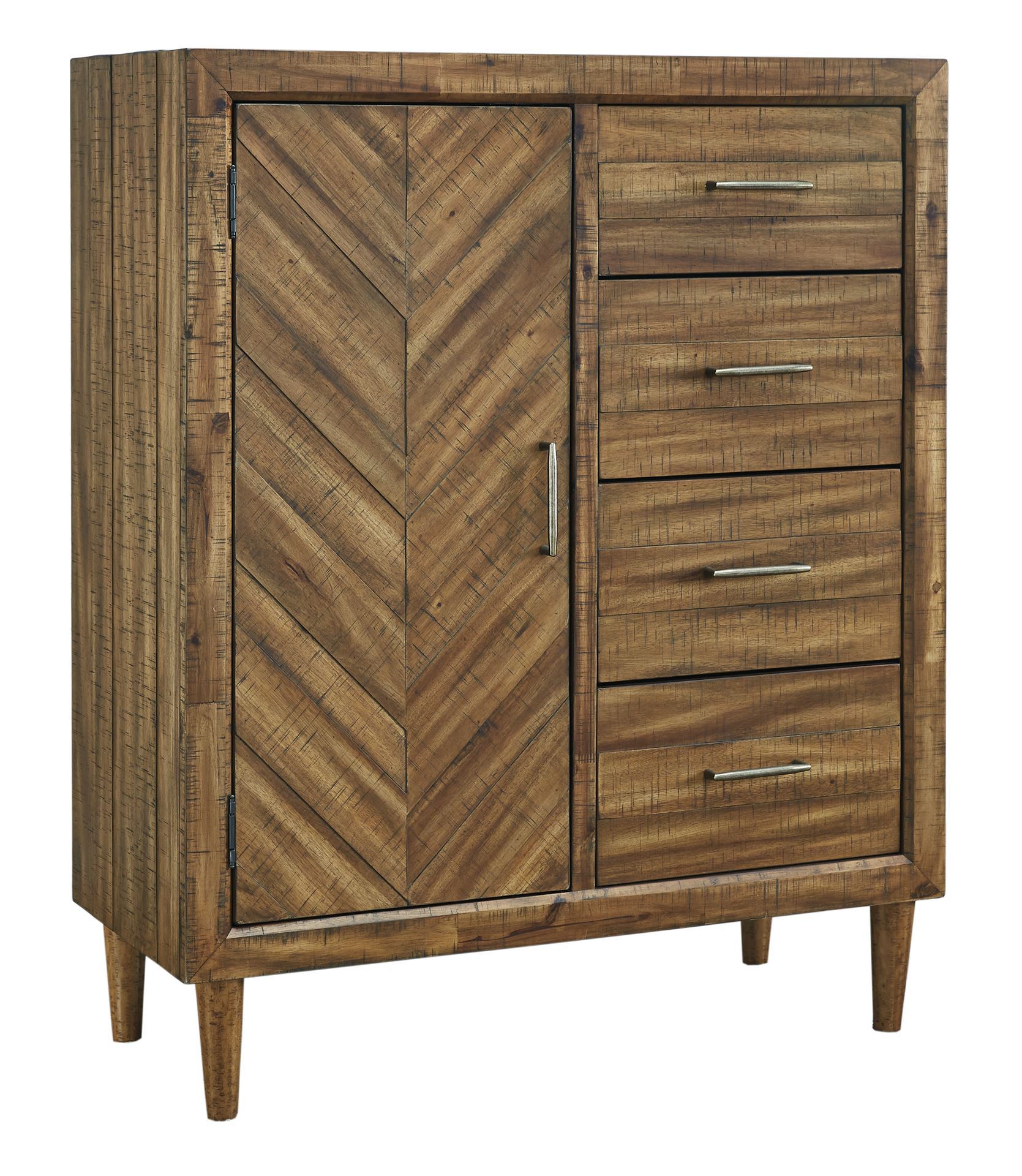 Made with Acacia veneers and select hardwood solids and finished in a medium brown finish with saw kerf distressing effect. Design of bedroom is contemporary with a touch of the rustic aesthetic. Cases have profiled frame and tapered round turned legs. Drawer fronts, sides and top have a planked look. Fully finished French/English drawer box with ball bearing drawers glides. Chevron veneer layup of headboard panel and door of bachelor chest. Picture frame mirror.