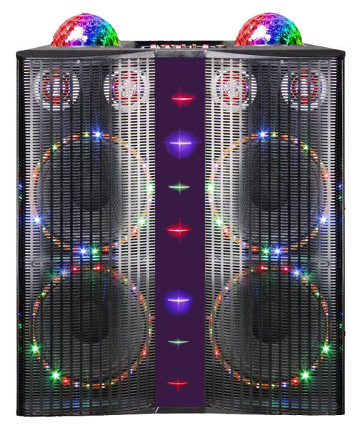 Bluetooth Cabinet Speaker not only streams your favorite songs wirelessly, but also includes USB/SD playback and an FM tuner. Quad 10” Woofers and dual 1” Tweeters blast RGB LED panels and dual disco lights pulse to the beat.