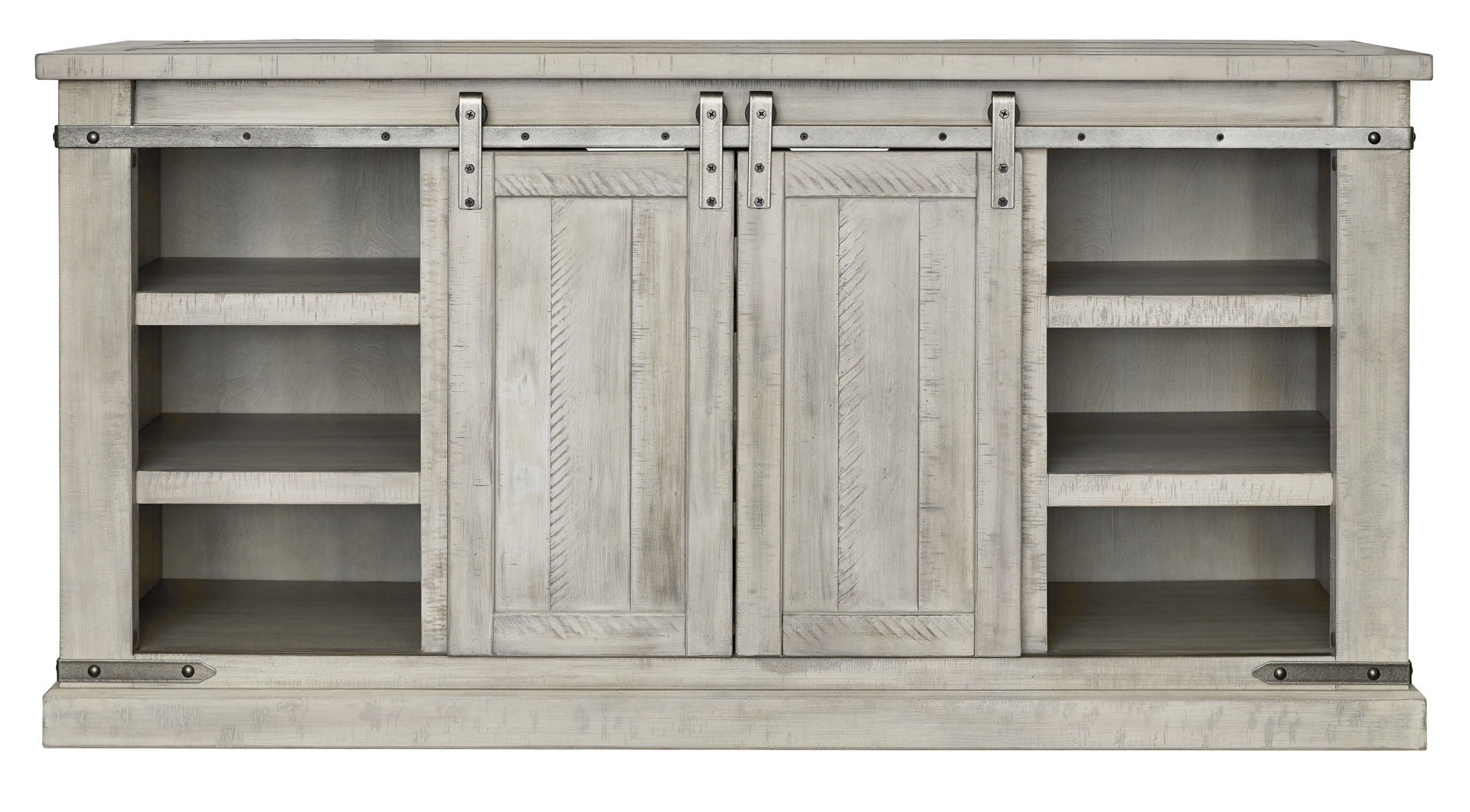 A brilliant rendition of modern farmhouse style (sliding barn doors and all), the Carynhurst TV stand is right in tune with your richly relaxed sense of style. The TV stand’s clean yet hearty profile is enhanced with a complex whitewash finish with charming distressing and plank-effect styling. Antiqued gray metal hardware is a sophisticated complement.