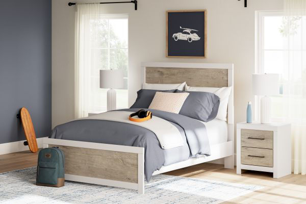 Relaxed yet striking, this full panel bed brings casual beauty and function to your dream destination. A delightful two-tone treatment blends a fresh, replicated oak grain with a matte white finish that's easy to love. Its simplicity lends a contemporary touch that suits your bedroom's style to a T.