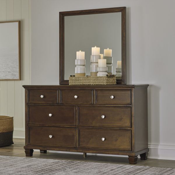 The casual design of this dresser and mirror introduces a time-honored look to your restful retreat. Spacious enough to hold all your essentials, this beautifully crafted piece is built to last with distinctive framing that gives the drawer fronts brilliant dimension. Whether your personal aesthetic is modern farmhouse or American classic, this chic set adds a warm, rich presence that's always right at home. Includes dresser and mirror Made with hardwood solids, birch veneer and MDF substrate Brownish cherry finish 7 smooth-gliding drawers with dovetail construction and ball-bearing side glides Round metal drawer knobs with satin nickel-tone finish Tapered feet Framed drawer fronts Mirror attaches to back of dresser Assembly required