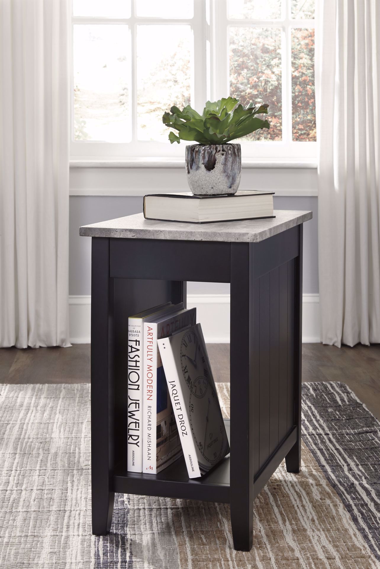 Chair side end table with RTA construction has paneled sides. Made with paint grade materials and painted in a black finish. Features AC power supply with 2 USB charging ports.