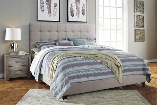 Serenity now. This upholstered bed is sure to awaken a love for modern platform styling with a softer side. Plush to the touch and so easy on the eyes, a pale beige fabric hugs the bed—from the chic headboard with square button tufting, to the low footboard and side rails, emanating the calming mood you long for in the bedroom. Mattress and foundation/box spring sold separately.