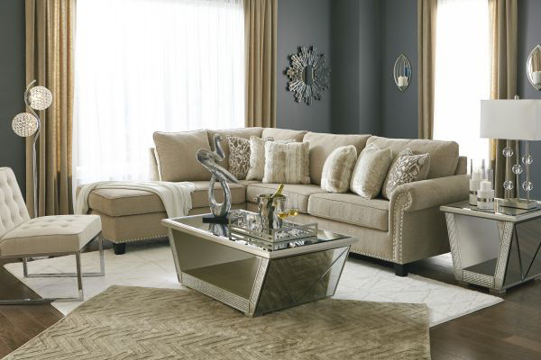 Enticing in chic and sophisticated putty for a look of everyday luxury, this 2-piece sectional simply says, “You’ve got great taste.” Elements that bring in just enough glam include pewter-tone nailhead trim and fanciful roll arms that beautifully go with the flow. Textured cheetah print, fur and crushed velvet throw pillows incorporate fabulous sheen and shine.