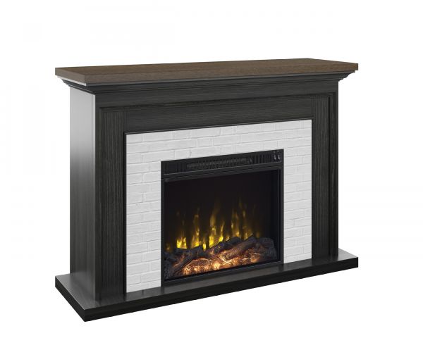 Enjoy the brilliant flames with the heat on or off with  to add year-round ambiance to your home. Stylish touches include the two-tone, modern farmhouse inspired finish and a faux brick surround. The insert includes a log set and crystal media kit for even more versatility!