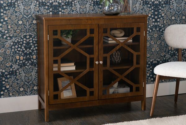 This transitional accent cabinet combines timeless style with functional design. It features a striking geometric front pattern that beautifully accents the glass doors, adding visual interest and sophistication to any space. The cabinet offers spacious interior storage, making it ideal for organizing and displaying décor, dinnerware, or everyday essentials. Designed to complement a variety of interiors, it is available in brown, black, gray, white, and salmon, allowing you to choose the perfect finish for your home.