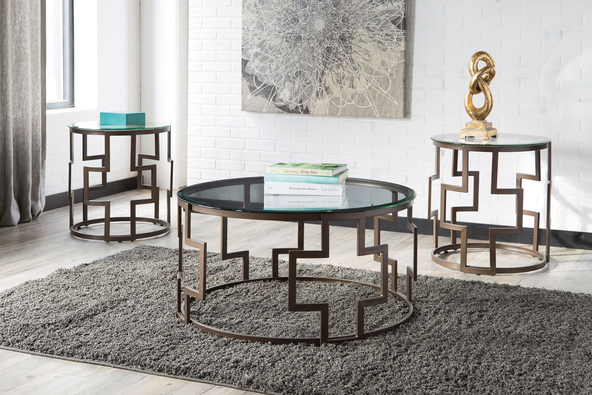 Frostline coffee table set takes a cool twist on contemporary style. Drum form metal bases sport a graphic keyway design that’s so striking. Clear glass tabletops naturally enhance the open and airy mood.