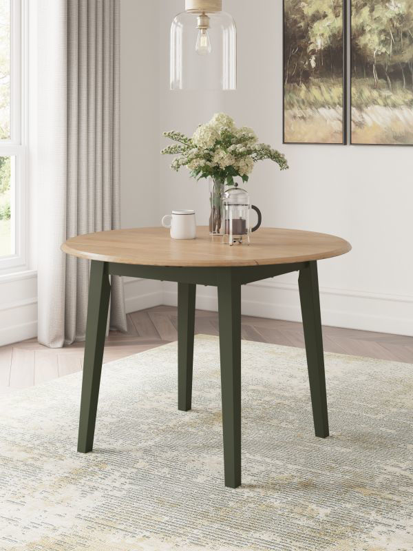 Complement your home’s simply relaxed sensibility with this drop-leaf dining table. A charming green hue offers a chic contrast to the natural wood tone, for a casual look that vibes with a variety of aesthetics. When guests drop by, convert it from a space-saving two-seater to a larger table with the two drop leaves. Whether you're sipping your morning coffee, settling in for dinner or working from home, this table is smartly designed for everyday comfort and style.