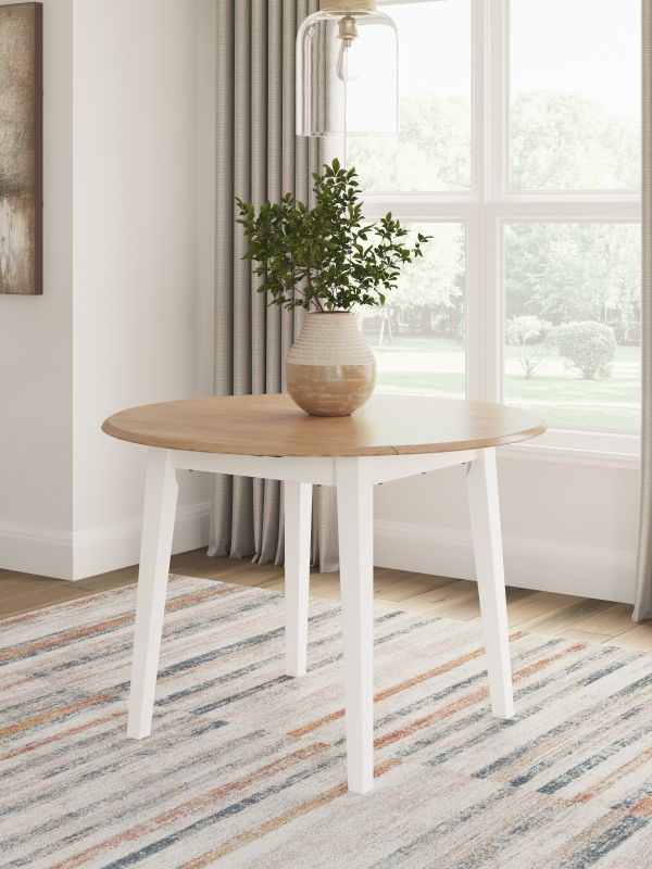 Complement your home’s simply relaxed sensibility with this drop-leaf dining table. A crisp white hue offers a chic contrast to the natural wood tone, for a neutral look that vibes with a variety of aesthetics. When guests drop by, convert it from a space-saving two-seater to a larger table with the two drop leaves. Whether you're sipping your morning coffee, settling in for dinner or working from home, this table is smartly designed for everyday comfort and style.
