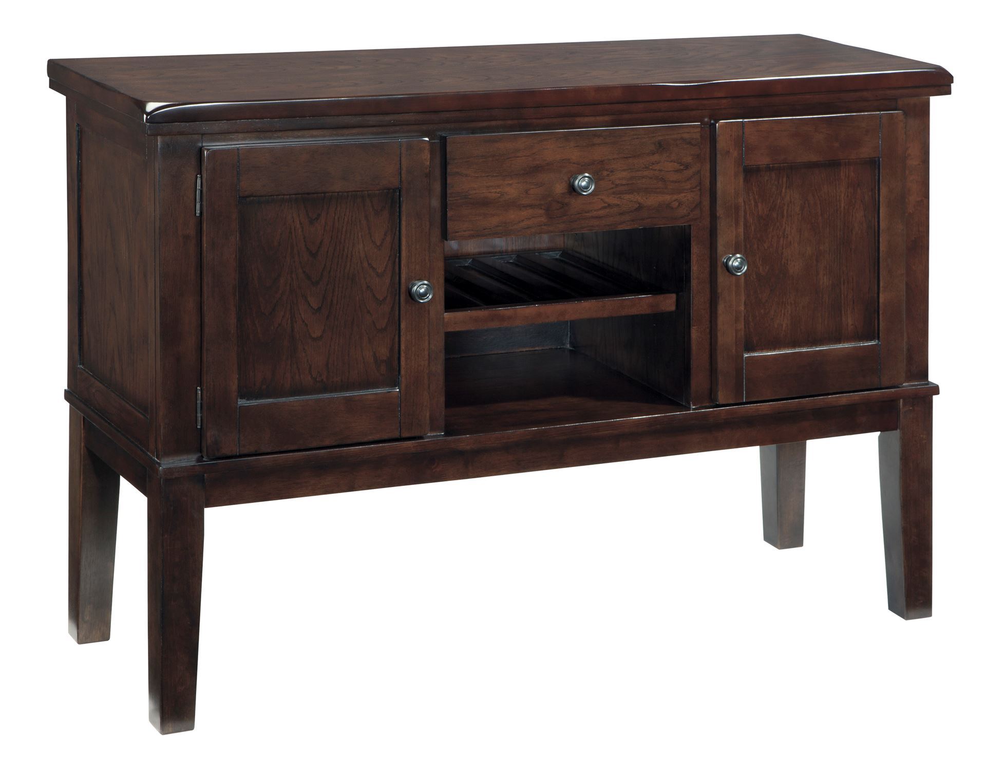 Server has fully finished drawer boxes with ball bearing side guides. Sturdy looking knobs have detailed ring design and finished in a bronze color with golden undertones.