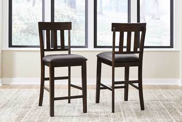 Modern sophistication, beautifully served. This bar stool raises the bar with a cool, rake back design with staggered rungs for added interest. Dark and rich, the monochromatic finish enhances its sleek profile. Faux leather seat upholstery offers easy-care appeal.