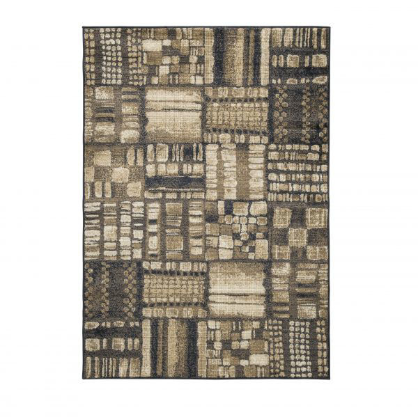 This area rug provides the building block for a contemporary look. Various sized block shapes form an array of perfectly imperfect patterns for natural appeal. Sporting calming shades of navy, brown, gray, white and gold this accessory is sure to delight.