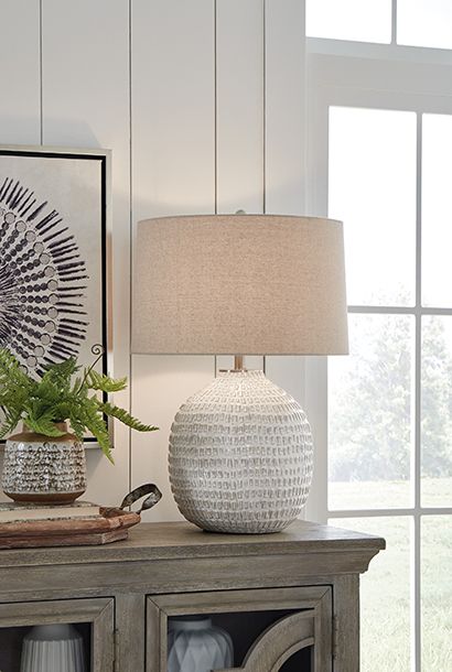 Style and function come together in the Jamon textured ceramic lamp to bring incandescent style to any space in your home. Combining a rounded base, accented with goldtone hardware, this lamp is capped off with a simple natural lampshade for complete elegance. Pair with a wide variety of furniture styles for a versatile indoor lighting option you'll love.