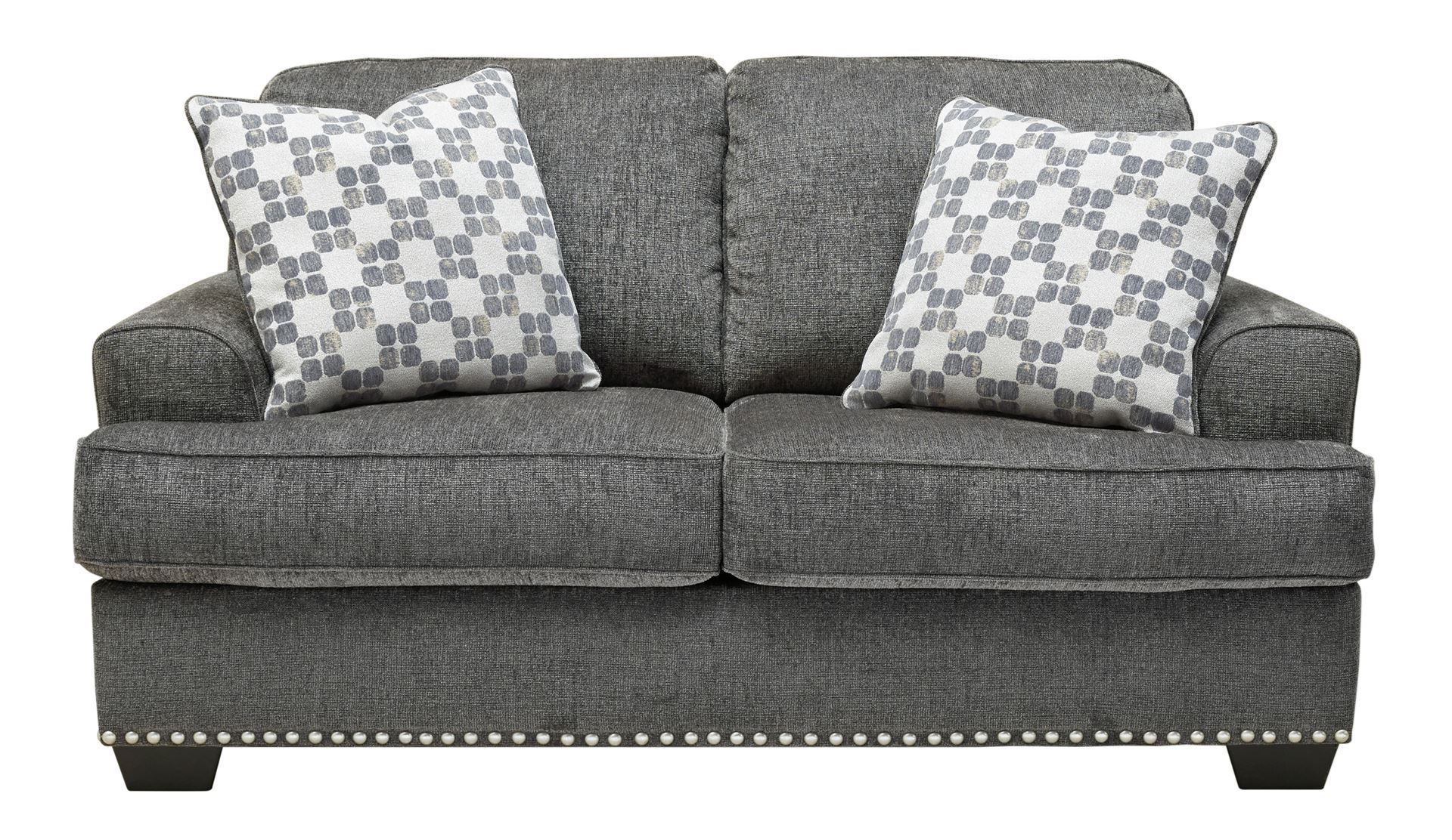 Don’t you love when furniture feels as good as it looks? There’s no doubt this loveseat makes a trendsetting first impression. Textural chenille fabric elevates the look of your room with its handsome gray hue. Pewter-tone nailhead trim brings an element of shine. Prop up the fashionable throw pillows or curl up with them as you get comfortable. Oversized scale with deep seating will give you plenty of those “I fell asleep here” moments.