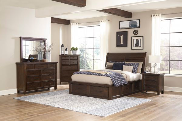 The transitional framing of the Logandale Collection allows for versatile placement within a number of classic bedroom decors, making a perfect choice for your home. A brown finish is utilized over mango veneer for subtle highlighting of its distinct grain. A total of 6 drawer units are located on the side rails and footboard of the Eastern King size bed creating additional storage space within your bedroom. The sleigh headboard is paired with a platform footboard resulting in an unfettered design. Dark finished metal knob and pull hardware front each drawer creating a complementing accent to the drawer fronts.