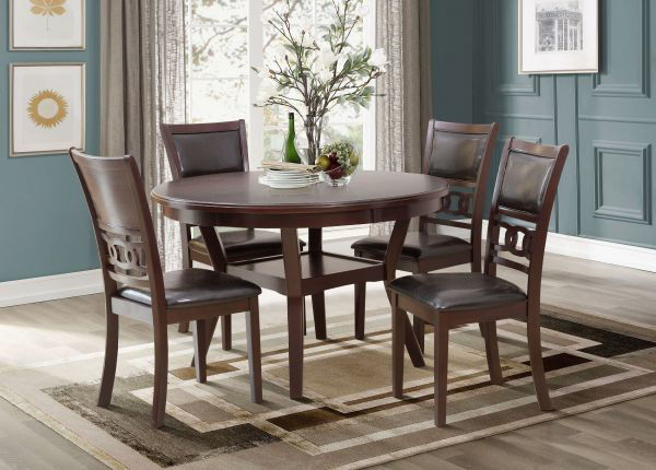 Casual Dinette features Rubberwood with Mindy Veneers. Display Shelf and PU Chair Cushions. Package Includes: Table and 4 Chairs