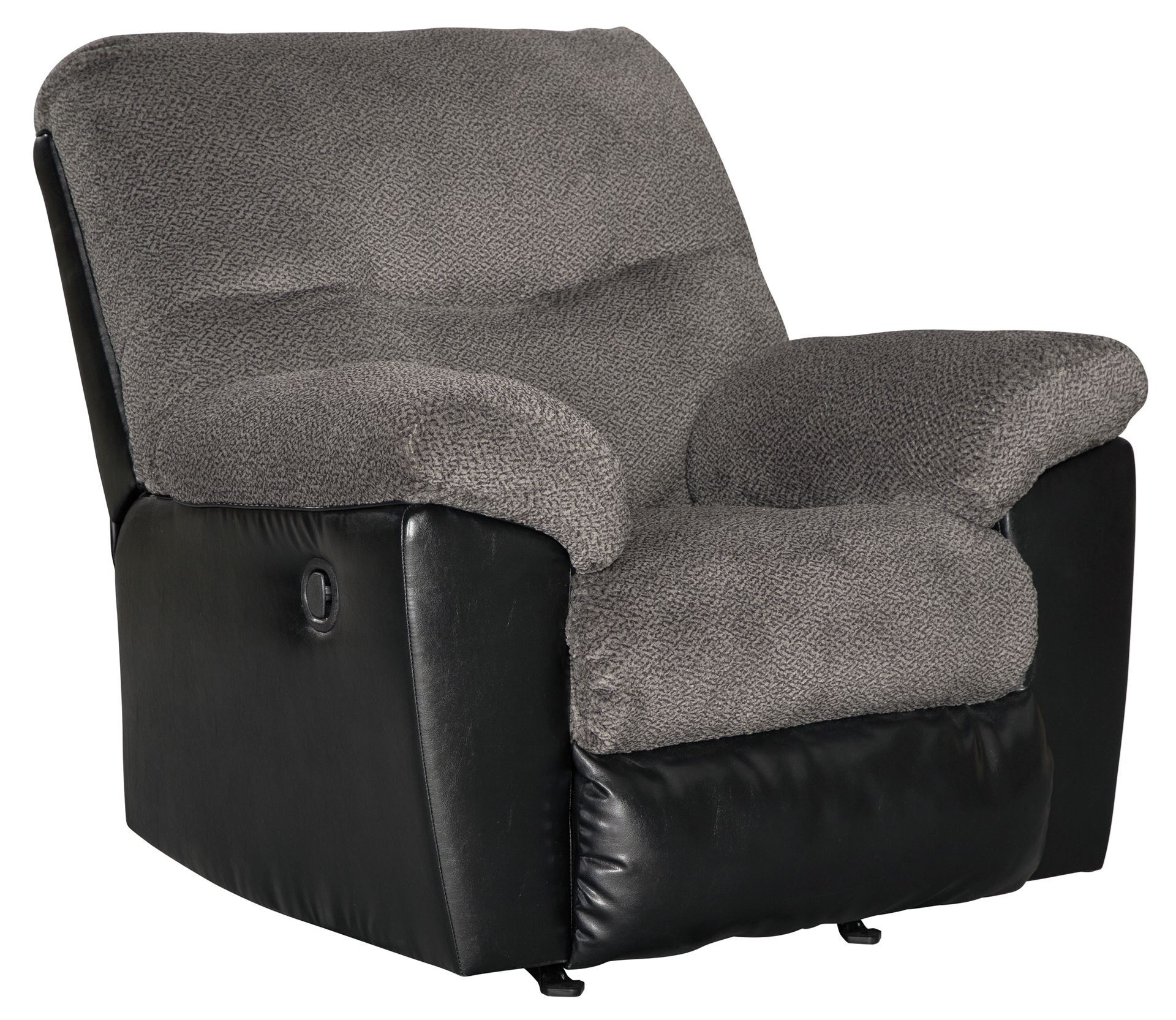 Comfort is inevitable with the Millingar rocker recliner. Handsome profile is teeming with chenille softness. Smokey gray textured cushions meet black faux leather for a quality look. Just one pull, and you’re on your way to endless reclining. Doubly plush armrests are right by your side.
