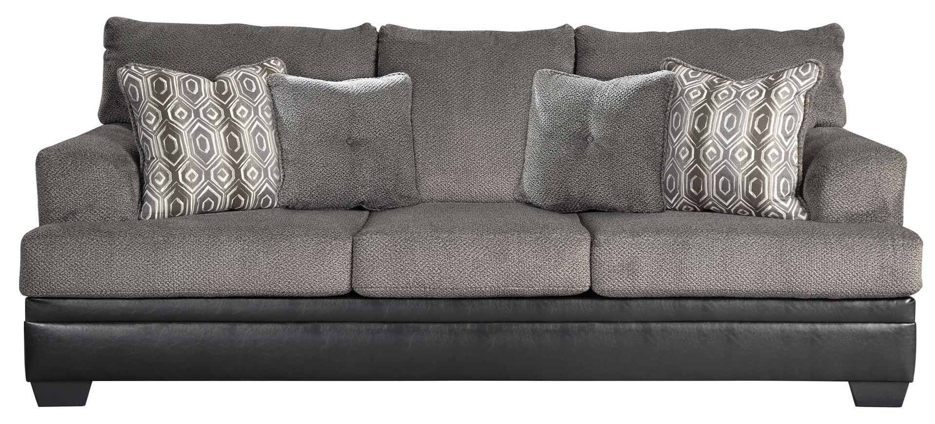 Comfort is inevitable with the Millingar sofa. Handsome profile is teeming with chenille softness. Smokey gray textured cushions meet black faux leather for a quality look. Throw pillows season this sofa with extra style flavor—one design with a center button and the other with a trendsetting geometric pattern.