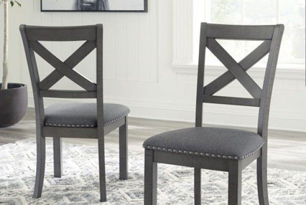 Going gray in the best possible way. This upholstered dining chair wows with an utterly on-trend smoky gray finish and X-back styling. Its softly cushioned seat with gray textured upholstery and nailhead trim will have you lingering a little longer at mealtime. Just a touch of distressing helps it fit right in with your modern farmhouse decor.