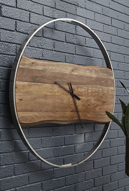 Time to simplify your style? This round wall clock is a mastery in minimalism. Its striking brown finished wood with silvertone finished frame and hands prove that less really is more—just two simple hands floating on a wooden plank. This streamlined clock is the ultimate designer piece for lovers of casual aesthetics. Wood and metal Faux live-edge design Keyhole hanger Horizontal hanging only