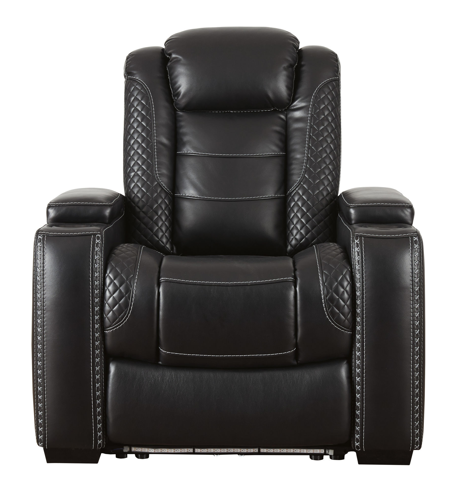 The Party Time power recliner takes its cue from luxury automobiles with lattice- and cross-hatch stitching, for a richly tailored aesthetic that gives you plenty of reasons to celebrate. Sumptuously padded cushions and dramatic midnight black faux leather upholstery add to the indulgence. When it’s time to rev up the action, the recliner’s reclining bucket seat, Easy View™ power adjustable headrest, LED accent lighting and USB charging port keep you in the driver’s seat.