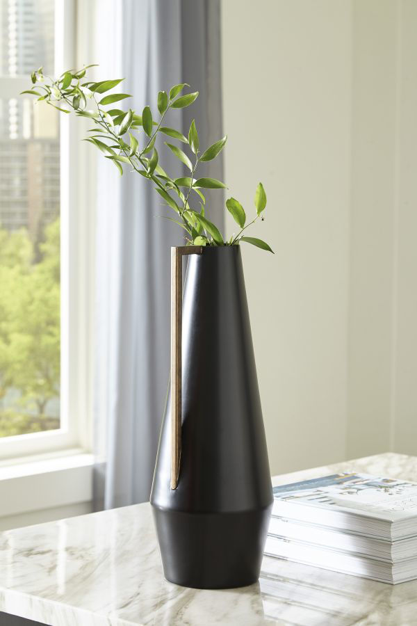Keep your home contemporary cool from head to toe with this vase. Softly sloping in form, it's finished in a sleek black. An angular goldtone accent adds a dash of glam, creating a subtly dynamic overall design. Made with metal Black finish Angular metal accent Accent in goldtone finish