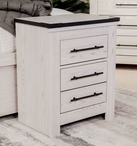 White rustic finish with replicated cedar grain with authentic touch. Top edges of cases are finished with faux metal banding and captured with a nail trimmed corner piece. Cases feature a framed front and pilasters. Contemporary handles in a dark pewter color finish. Side roller glides for smooth operating drawers. Drawer interiors lined with a replicated linen design for a clean, finished look. Queen and king panel headboards (157,158) designed with a chevron pattern and feature decorative modern sconce lights in a matte black finish with champagne colored accents. Both USB and Qi wireless charging options are provided with the nightstand. Safety is a top priority, clothing storage units are designed to meet the most current standard for stability, ASTM F 2057 (ASTM International). Drawers extend out to accommodate maximum access to drawer interior while maintaining safety.