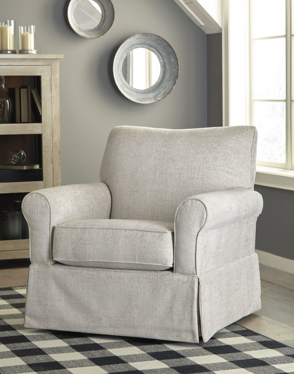 Thanks to its tailored skirt, this swivel glider accent chair sure doesn’t look like it can do a 360, but you’ll love the fact that it can. Whether your style is shabby chic, modern farmhouse or American classic, this swivel chair is sure to be sitting pretty.