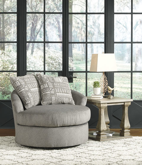 Flaunting a trendsetting silhouette, the Soletren swivel accent chair puts the contemporary in your contemporary home. Its 360-degree swivel gives you an around-the-room view to complement your comfort. Microfiber fabric satisfies your need for a piece that feels as good as it looks. Accented with soft jacquard chenille throw pillows for a splash of geometric pattern and color contrast.