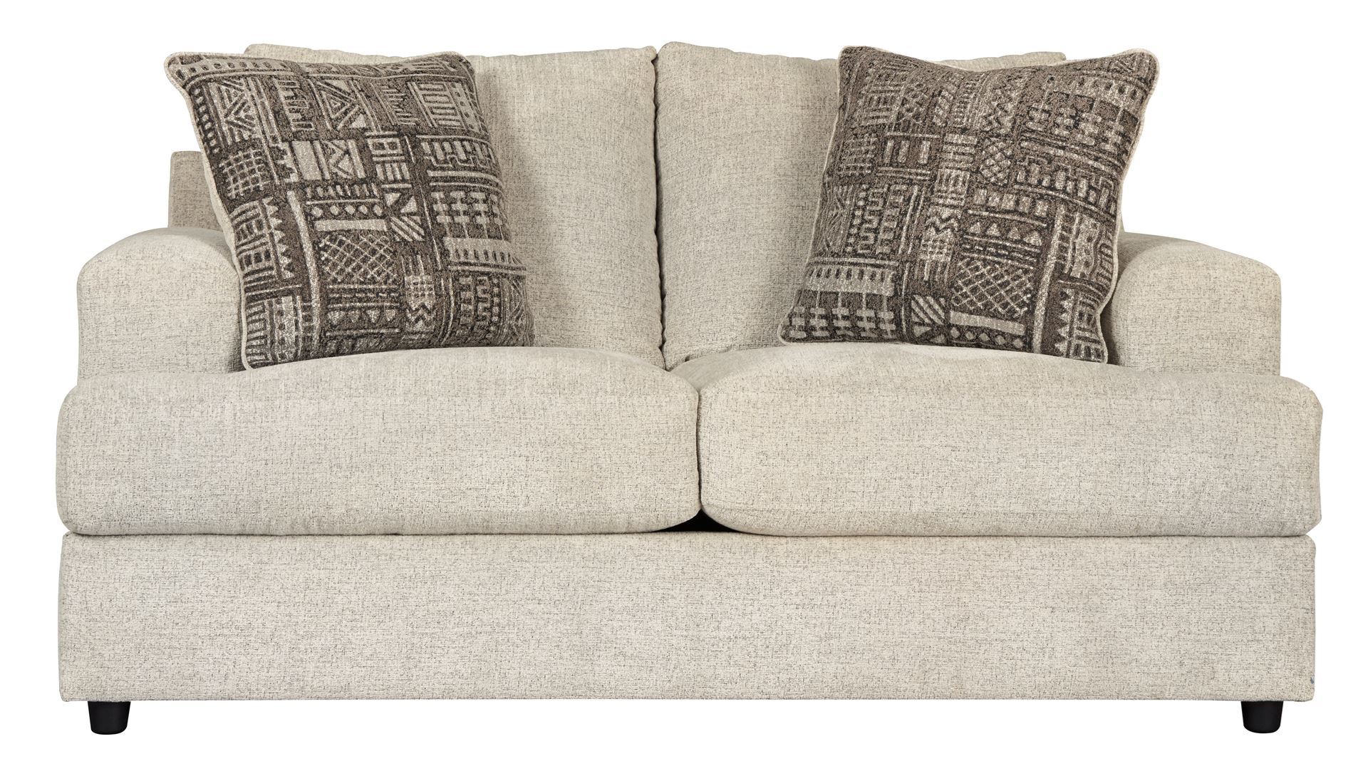 Flaunting a trendsetting silhouette, the Soletren loveseat puts the contemporary in your contemporary home. Its “three over two” profile eliminates the center seat cushion, giving you elongated plushness and deep seating. Microfiber fabric satisfies your need for a piece that feels as good as it looks. Accented with soft jacquard chenille throw pillows for a splash of geometric pattern and color contrast.