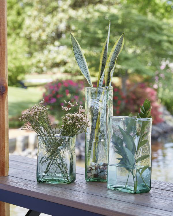 These vases, made of transparent green glass, provide a sturdy foundation for a full bouquet of your favorite long-stemmed blooms. With a fluted wide opening, these beautiful vessels provide ample room to place flowers perfectly. Or use them with flameless candles to create a romantic atmosphere outdoors. The uniqueness of these vases designs produces a gorgeous focal point for any room or event. Made of glass Green finish Made for indoor/outdoor use Clean with a soft, dry cloth