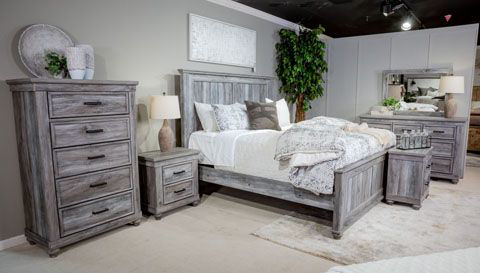 Smokey gray finish over replicated Oak grain with authentic touch. Large scaled traditional bedroom collection features case pilasters, framed drawer fronts and bun feet. Large dark pewter color handles with an aged appearance accent the cases. Side roller glides for smooth operating drawers. Drawer interiors lined with a replicated linen design for a clean, finished look. Both USB and Qi wireless charging options are provided with the nightstand. Panel headboards feature inset panels, and crown moulding on the top of the headboard and footboard. Mirror (36) has the versatility to mount on the dresser or to the wall horizontally or vertically. Safety is a top priority, clothing storage units are designed to meet the most current standard for stability, ASTM F 2057 (ASTM International). Drawers extend out to accommodate maximum access to drawer interior while maintaining safety.