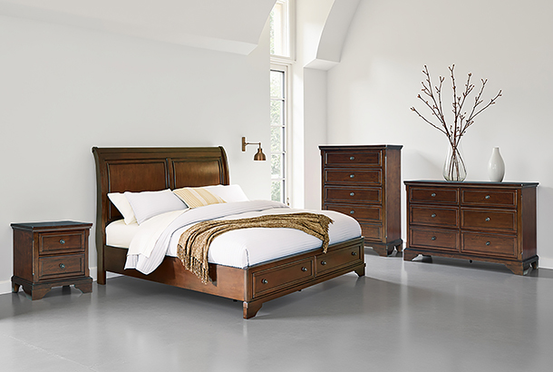 Timeless traditional design. Made with hardwood solids, MDF substrate and select hardwood veneer. Finished with a warm brown Cherry color for a casual traditional aesthetic. Drawers features fully finished interiors, French/English dovetail construction and heavy duty ball-bearing side glides. Framed drawer fronts with round metal knobs finished in a dark bronze coloration. Bed features a sleigh headboard with double framed panels and a low profile footboard with two full width drawers for extra storage space. Bed includes a 17 piece mattress support system. No foundation box spring required.