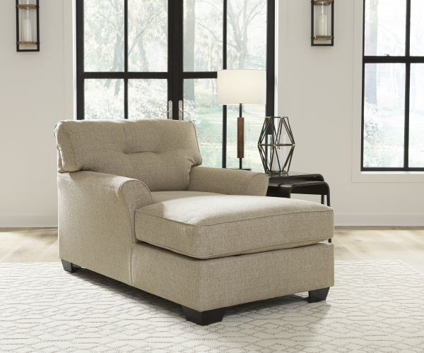 Stretch out in style with this richly upholstered chaise. Tailored touches including flared armrests and tufted back cushioning infuse an upscale sensibility. Textural tan chenille fabric is loaded with neutral sophistication. What a brilliant way to bring everyday luxury to your living room, family space or bedroom retreat.
