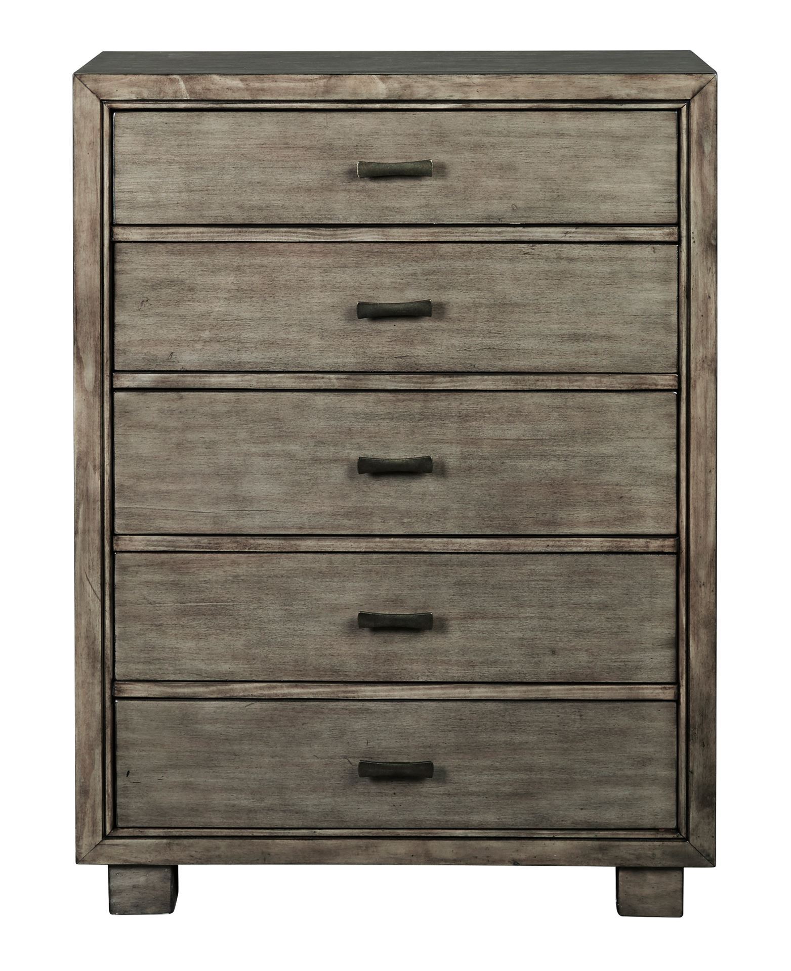 Casual contemporary styling. Constructed with engineered wood veneers and solid wood frames. Finished in a smokey gray color. Low profile bed design with an open gallery rail in the headboard. Dovetail drawer boxes with metal center guides. Metal bar pulls finished in a satin nickel color.