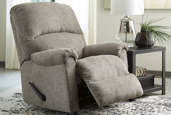 A mastery in "less is more," this rocker recliner manages to make cool, contemporary design so warm and cozy. Its soothing platinum-tone upholstery, incredibly plush to the touch, is a new twist on neutral. A curved divided back and a deeply tufted footrest give the clean-lined profile a sense of sumptuousness that's impossible to resist. One-pull reclining motion Gentle rocking motion Corner-blocked frame with reinforced metal seat Attached cushions High-resiliency foam cushions wrapped in thick poly fiber Polyester upholstery