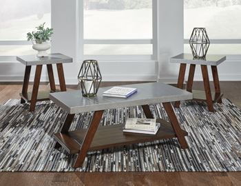 Tin is in. Bring it home in a farmhouse fresh way with the Bellenteen coffee table set. This trendy trio pairs a classic trestle design with a mottled faux tin top for a striking contrast.