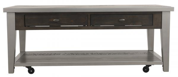 Two tone finish pairs a rustic gray wood with aged metallic silver color. Table top has butterfly veneer layup with breadboard ends, legs and shelf frame. Wood tone has a grayish brown color with textural effect. Bottom shelf for ample storage and display. Oval knob with a patinated silver finish. Drawers have a smooth operating glide system with sanded sealed interiors. French/English construction. Cocktail table has casters for mobility.