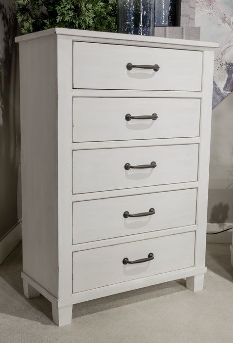 Casual farmhouse styling. Made with solid wood, MDF substrate and select wood veneer. Finished with an aged white coloration and contrasted with dark metal drawer pulls. Cases feature inset drawer fronts captured with beveled front frames for added dimension. Each drawer is clear sealed with dovetail construction and metal ball bearing side glides. The bed has framed raised panels for a trend-rite Farmhouse appeal and low profile side rails and footboard.