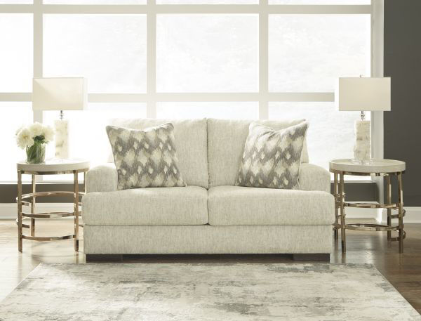 Easy on the eyes and irresistibly comfortable, this sofa is covered in luxurious chenille microfiber in a light, neutral hue that blends beautifully in a room. Wide track arms have a contemporary look and plush cushions cradle you comfortably. Textured accent pillows in complementary colors add subtle contrast.