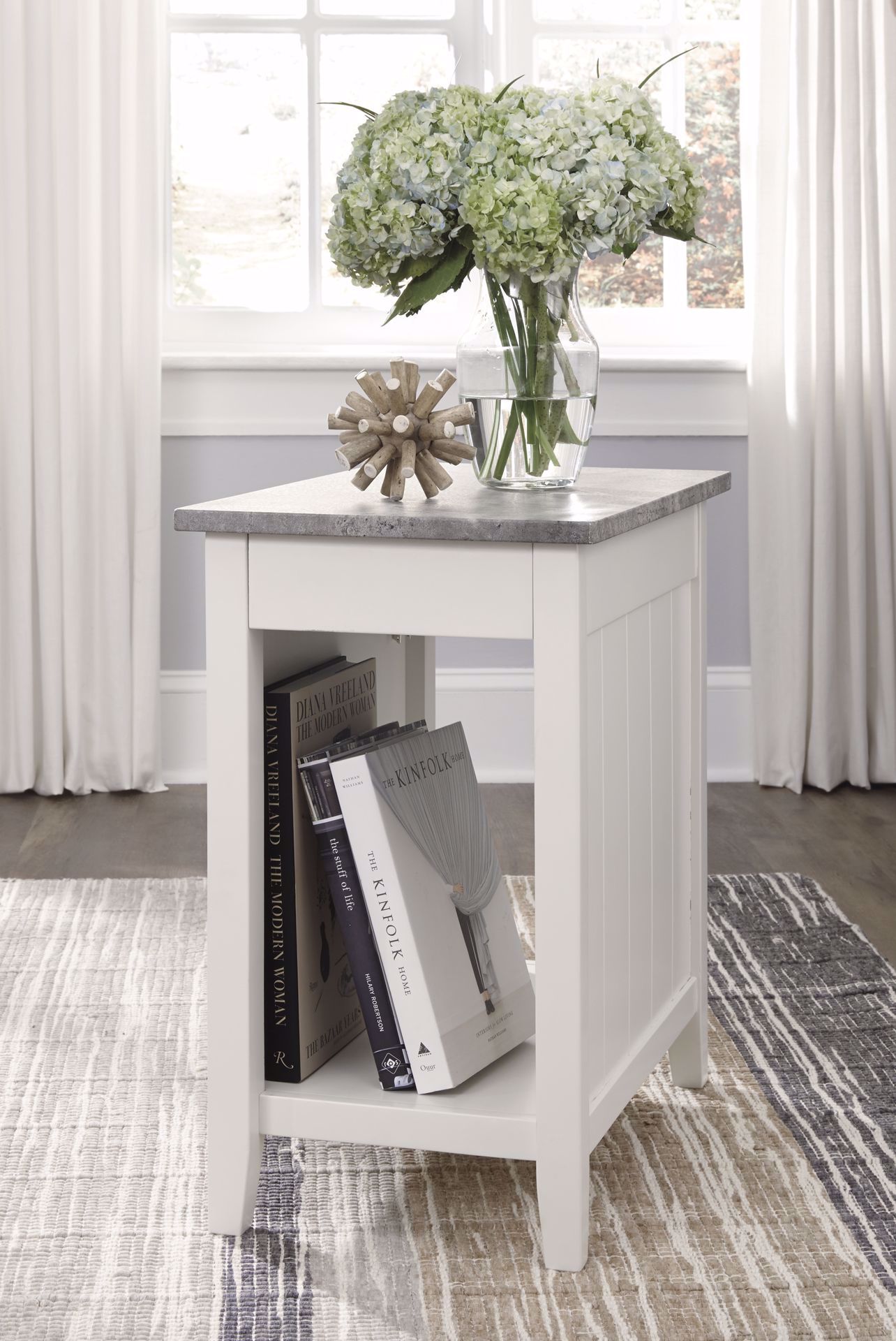 Chair side end table with RTA construction has paneled sides. Made with paint grade materials and painted in a white finish. Features AC power supply with 2 USB charging ports.