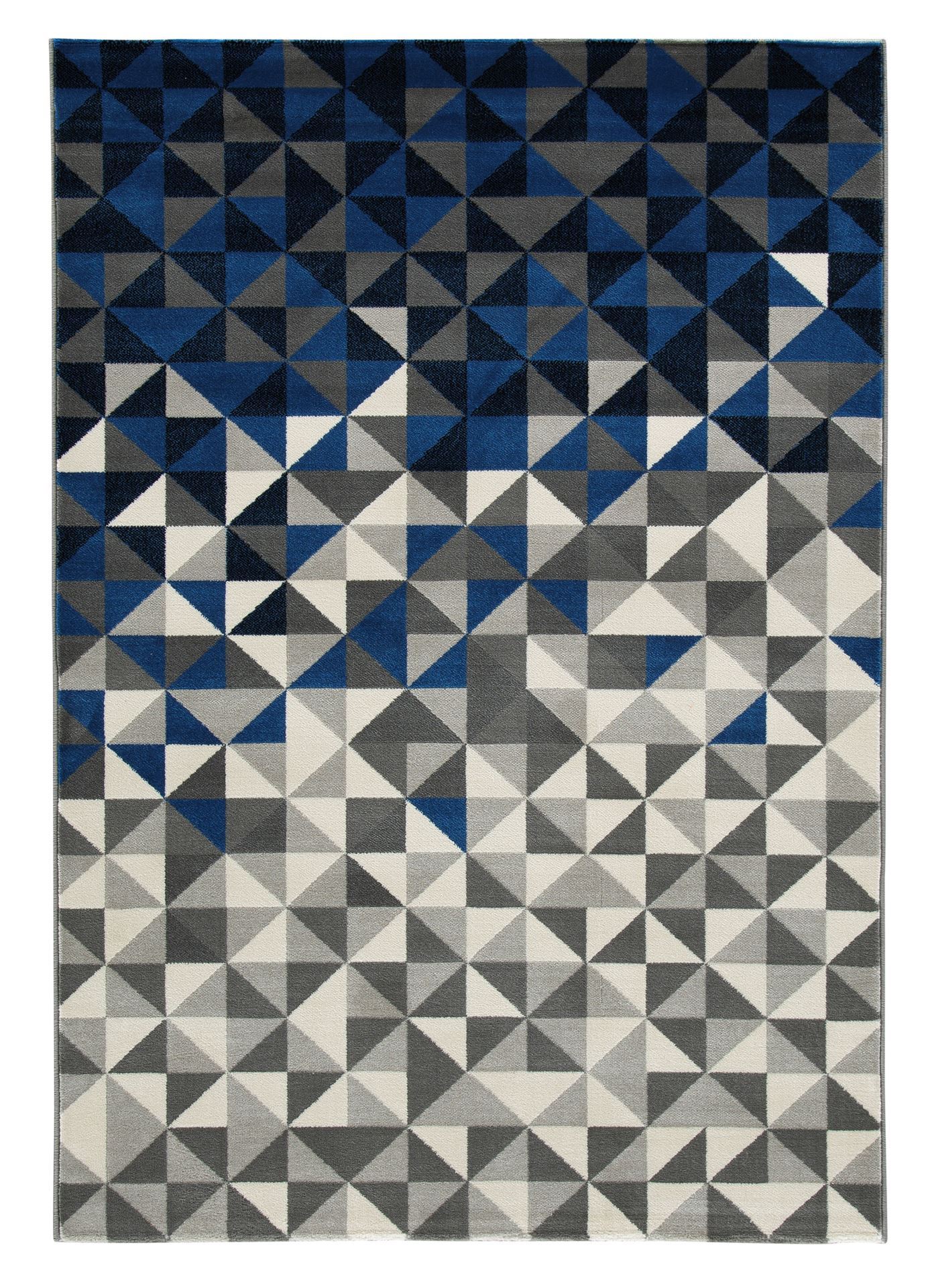 Contemporary triangles in black, blue, gray and white make a striking debut on this rug. The gradient, along with soft pile, will be sure to add modern flair and eye-catching interest underfoot.