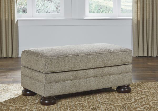 This sumptuously styled ottoman proves that a richly traditional look doesn’t have to break the bank. Choice of a plush chenille upholstery in oatmeal is earthy elegance at its best. Distinctively turned bun feet in a dark finish add to the ottoman’s substantial presence.